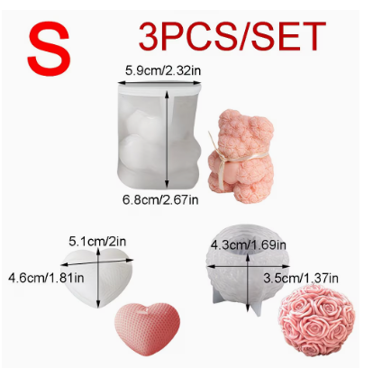 En Panchiscakes, te ofrecemos este hermoso trio de moldes pequeños con tres diseños: corazón tejido en 3D, osito de rosas y vela rositas redonda para Velas de Aromaterapia, Jabones Hechos a Mano, productos artesanales. la medida de las velas las puedes observar en las imágenes de la publicación.